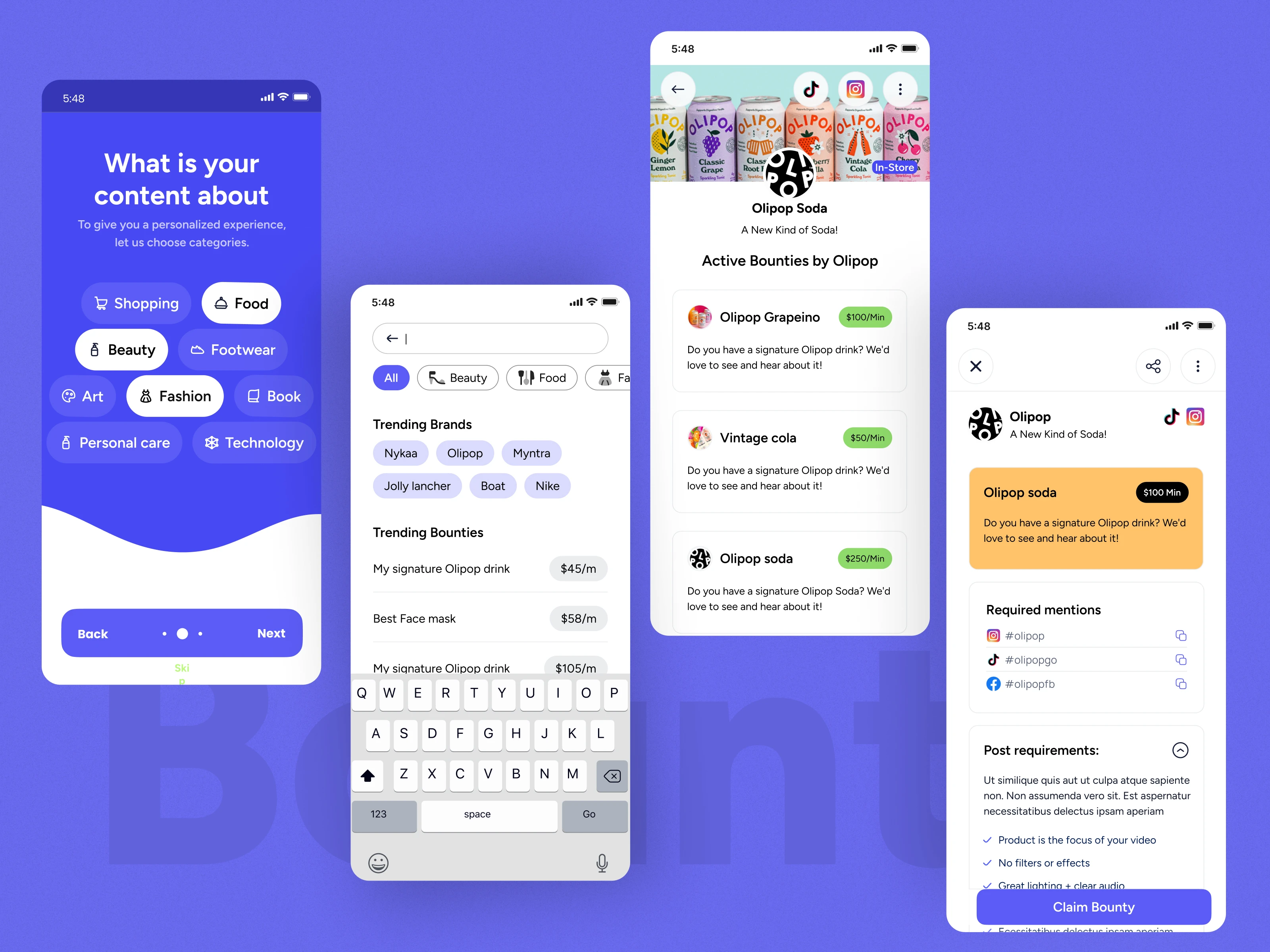 Onboarding — Hick's Law More choices at once means slower, more anxious decisions. So before a creator sees a single bounty, we guided them through a simple category selection — Fashion, Food, Beauty, Technology. This data then feeds directly into every search filter and discovery feed throughout the app. The platform learns who you are in the first sixty seconds.